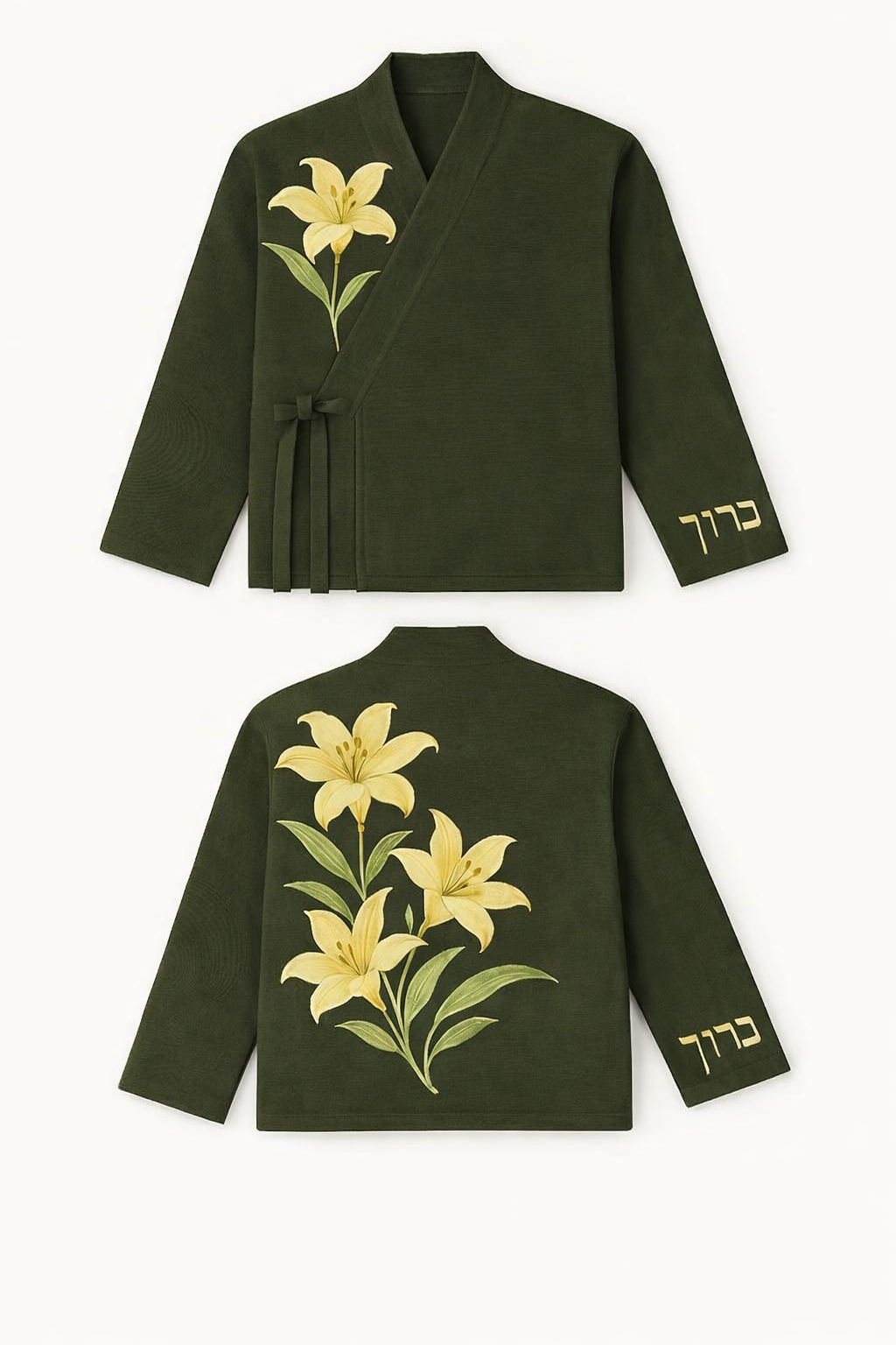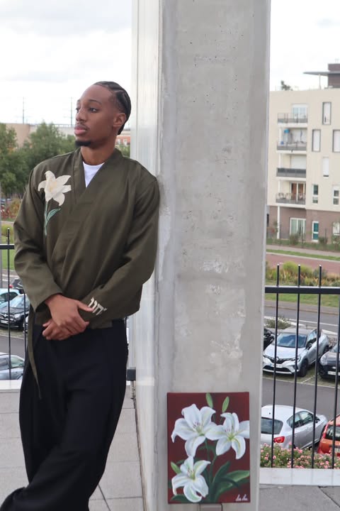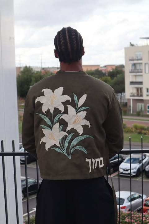 Blessed kimono en coton de haute qualité, au tombé structuré et élégant. Elle se distingue par ses broderies florales délicates de lys sur le devant et le dos, apportant une touche poétique et raffinée. Les finitions soignées et les détails brodés sur la manche renforcent son caractère unique et intemporel.